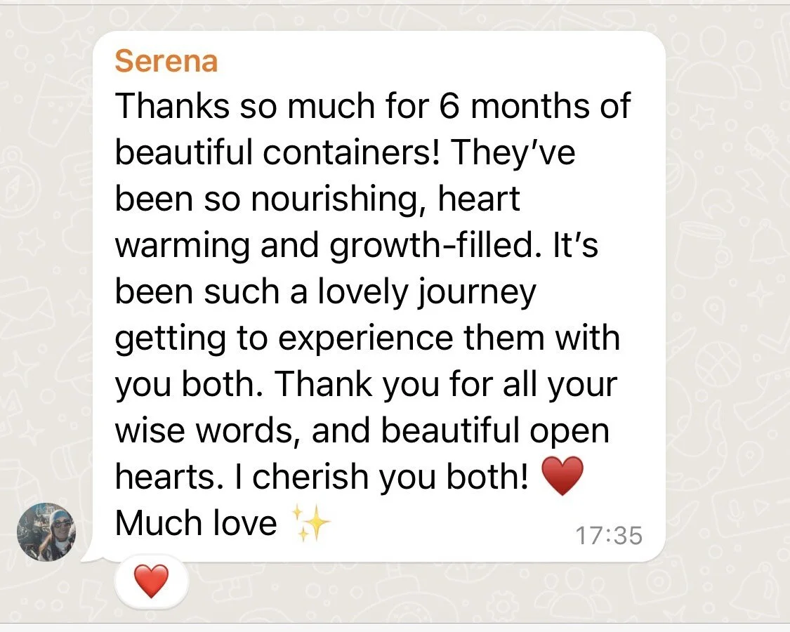 "loved the hosts kindness & calm energy! the prompts & music really helped set the aura to create a safe space for sharing."